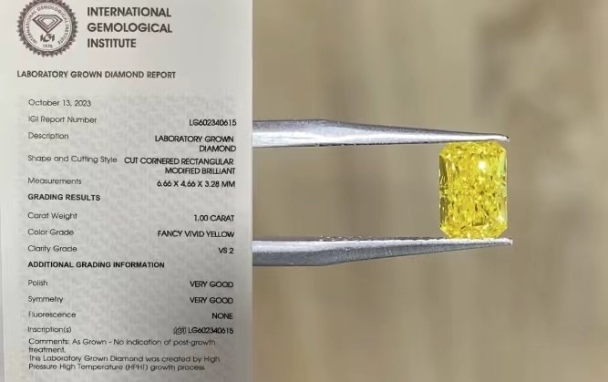 यह फैंसी विविड येलो और उत्कृष्ट बनाने (कट) प्रमाणित ढीला हीरा आईजीआई की रिपोर्ट के साथ आता है