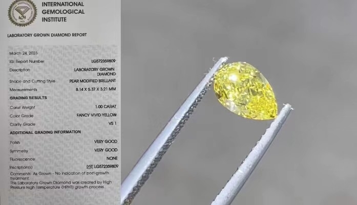 पीर लूल डायमंड, फैंसी ज्वलंत पीला, वीएस1, उत्कृष्ट, आईजीआई प्रमाणित